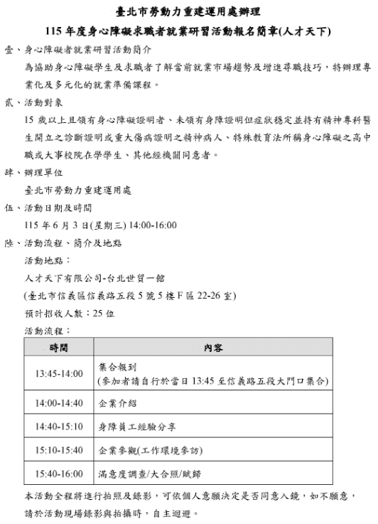 (二)115年6月3日(星期三)14:00~16:00,活動地點:人才天下有限公司-台北世貿一館。報名方式即日起至115年5月11日(星期一)或額滿為止,填寫報名表單:https://forms.gle/qxqC33Z3otX1PCqe6