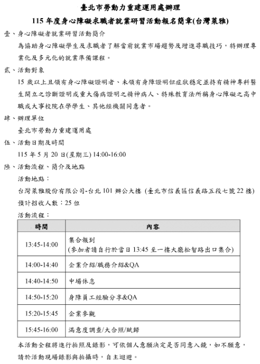 【轉知】臺北市勞動力重建運用處辦理「115年度身心障礙者就業研習活動」兩場次